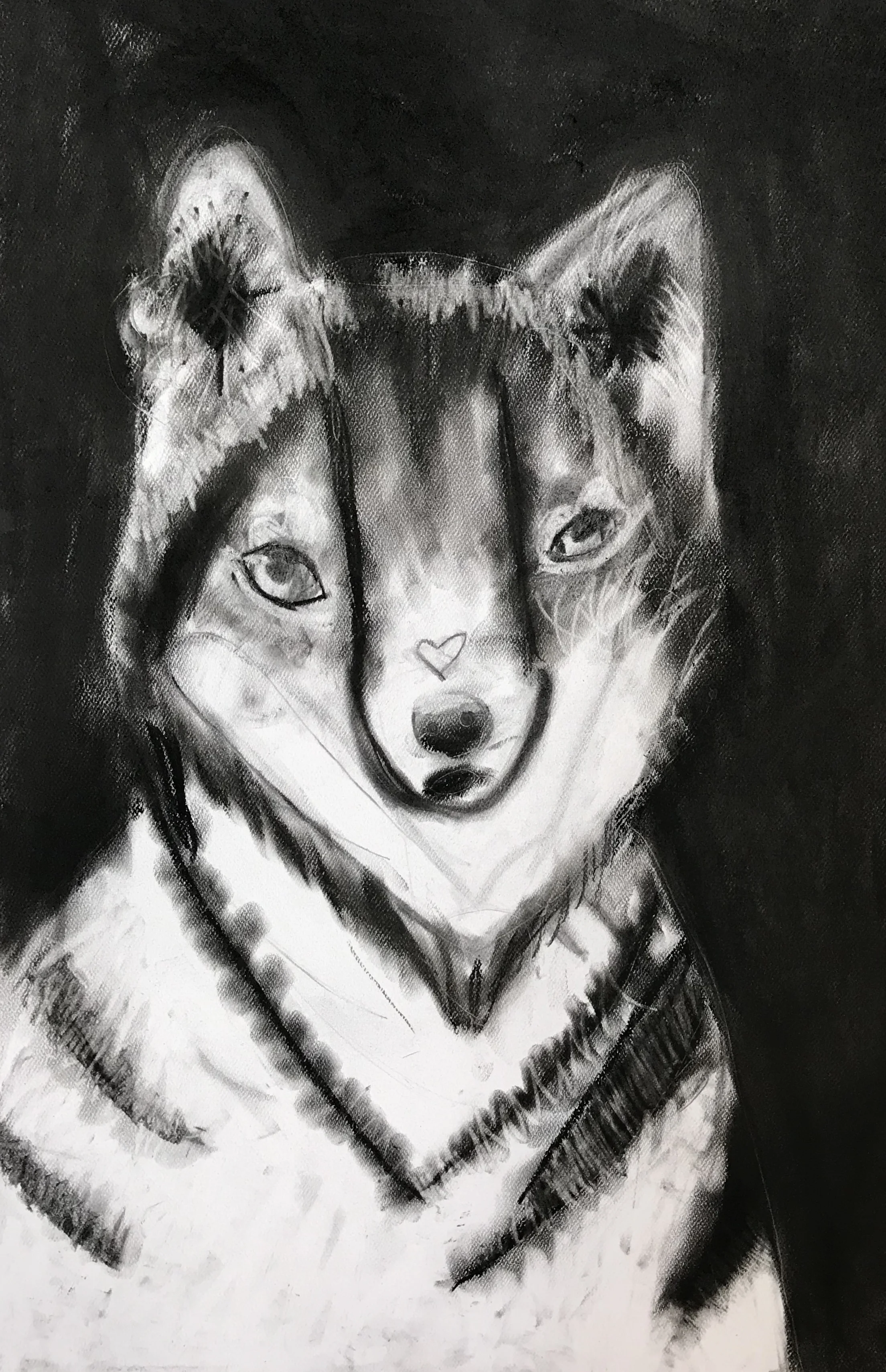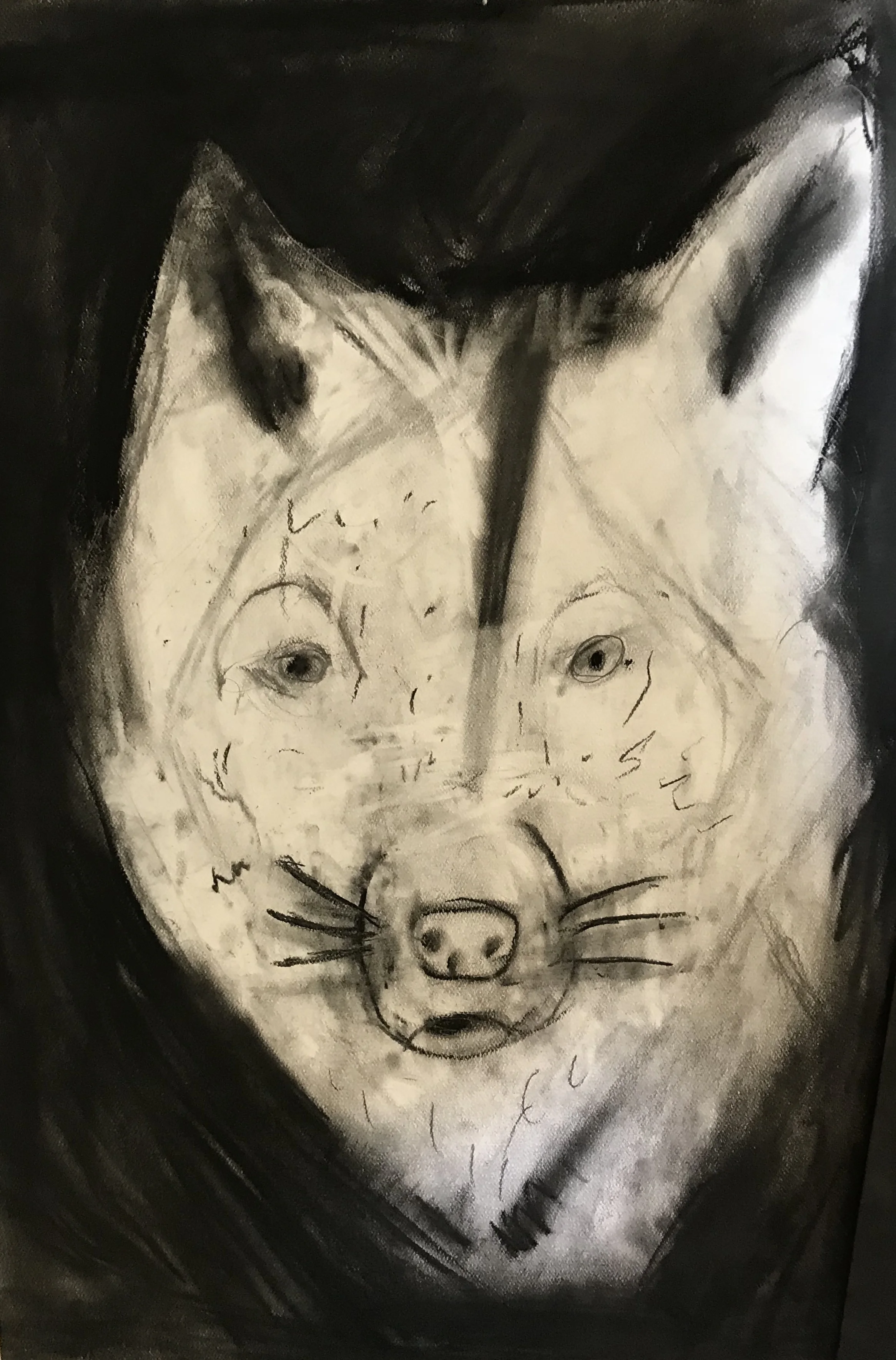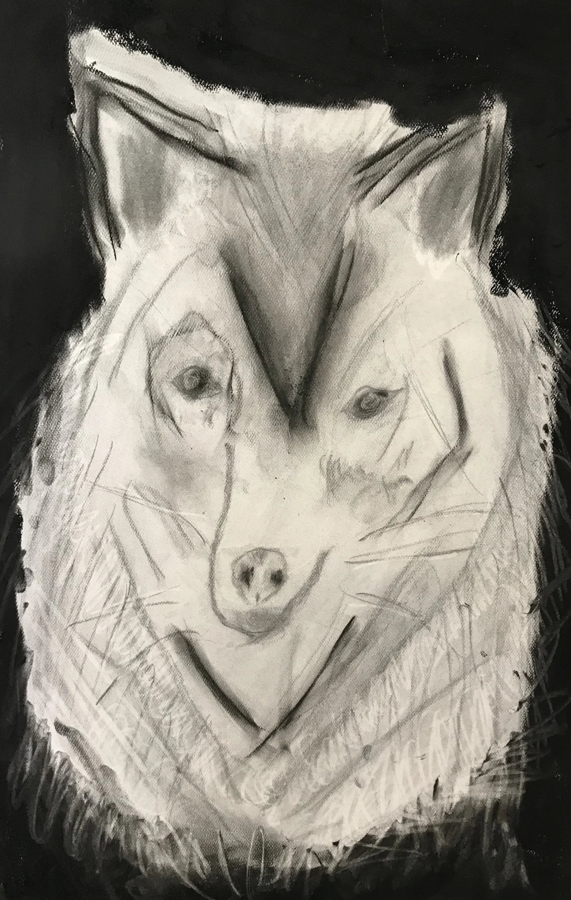 Charcoal drawing of a fox with a dark background, featuring distinctive black and white shading.