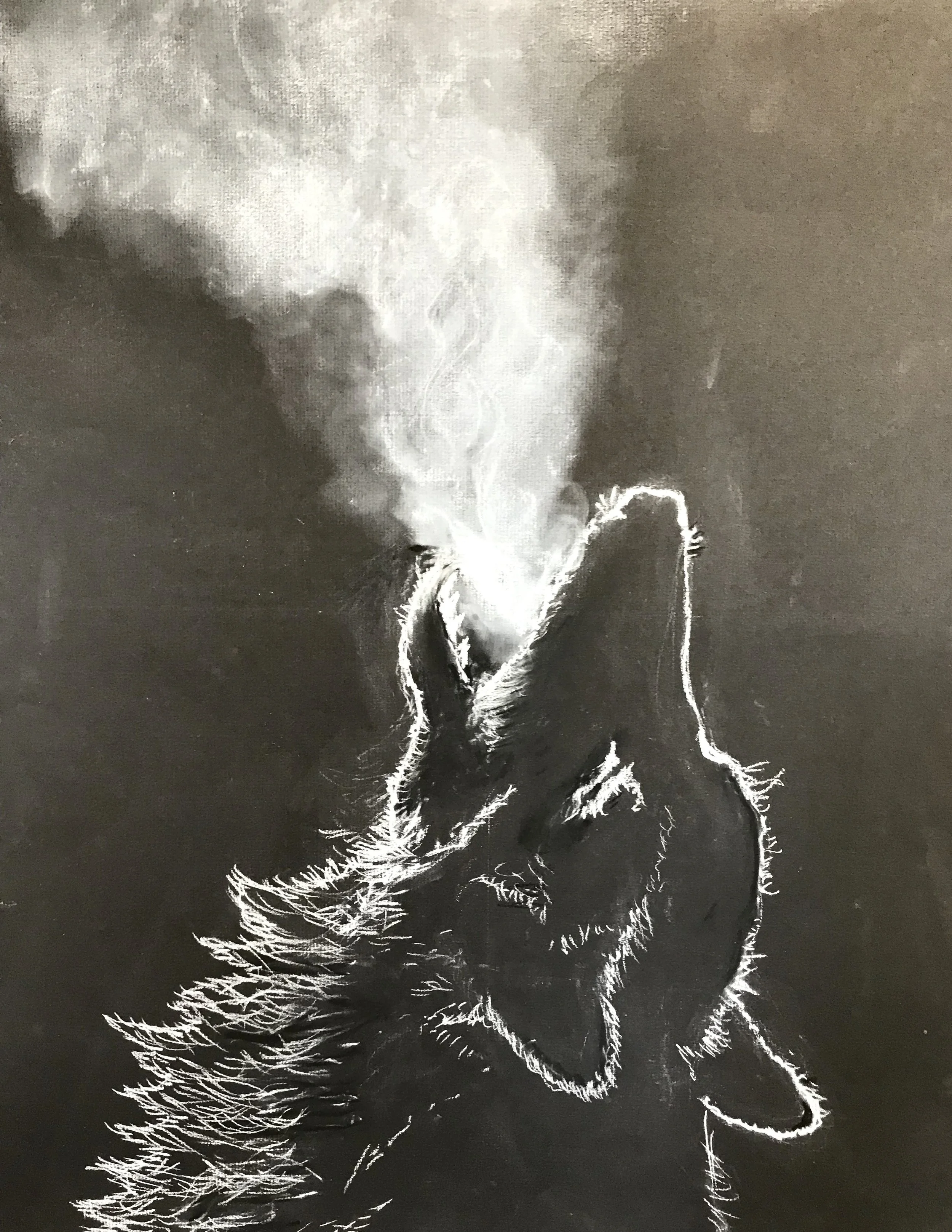 Black and white drawing of a wolf in charcoal
